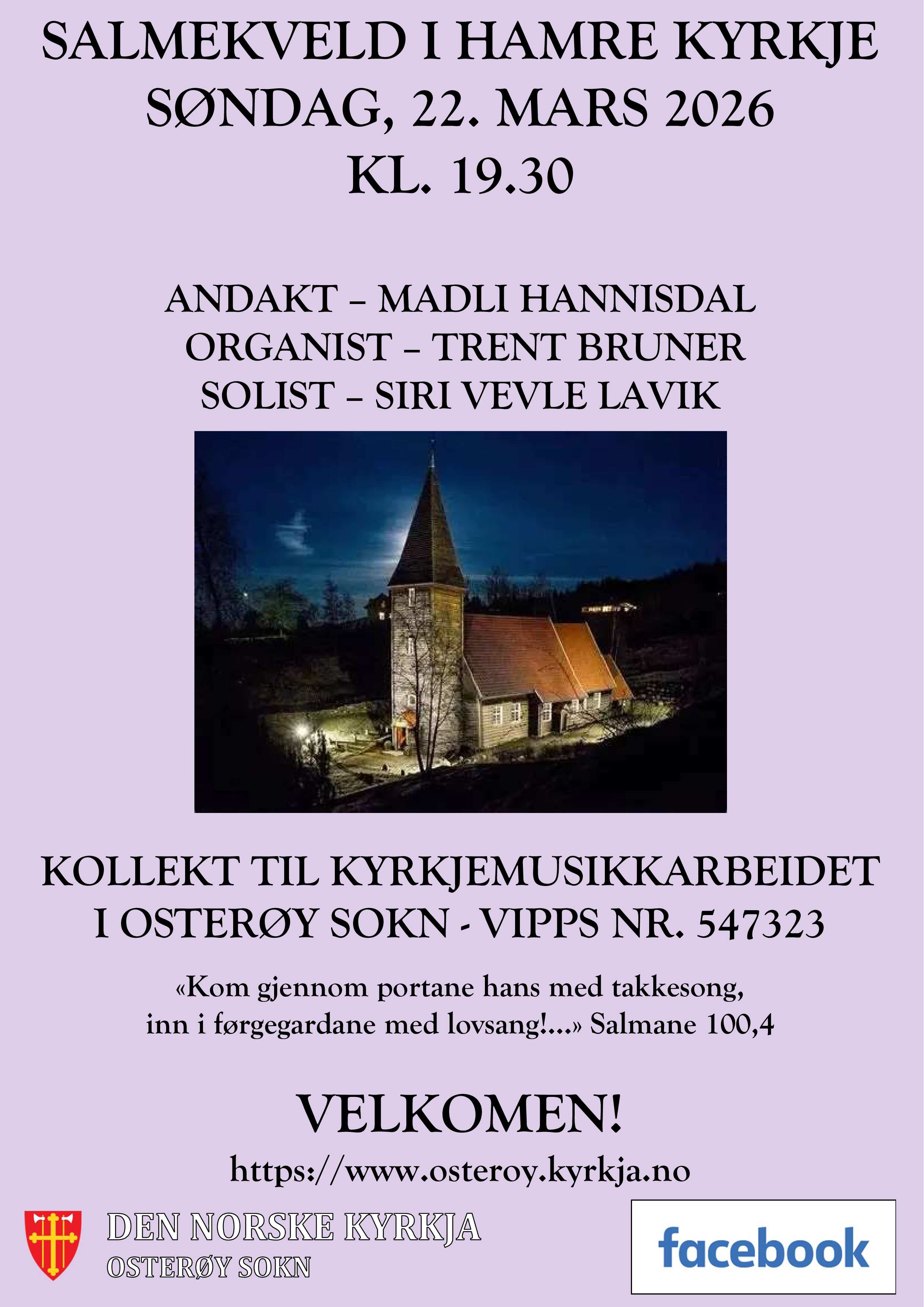 Salmekveld i Hamre kyrkje begynner kl. 19.30. Organist Trent Bruner og solist Siri Vevle Lavik deltar. Madli Hannisdal har andakt. ...