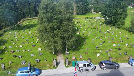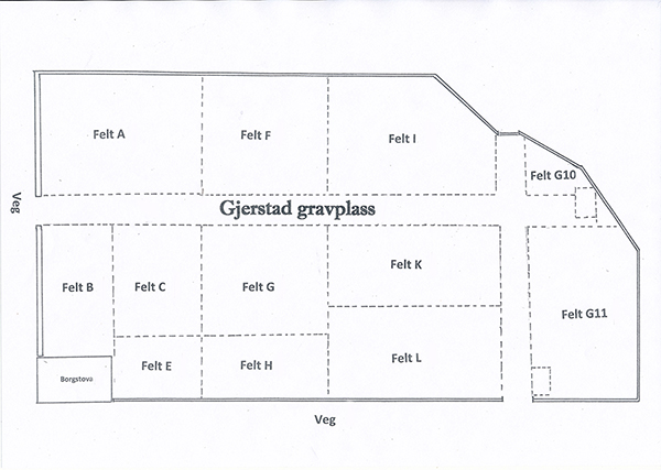 Gjerstad gravplass ligg ved kyrkja. Her er det nær 1450 graver, delt opp i 6 felt innanfor murane til kyrkja. Den nye gravplassen, over vegen, er delt inn i 13 felt. Teikninga nedafor viser kor dei ulike felta er. Er du på leit etter ei grav, og ikkje veit heilt kor den er, så kan du kontakte kontoret på tlf 56 97 88 30 og få opplyst kvar grava ligg.