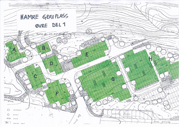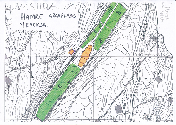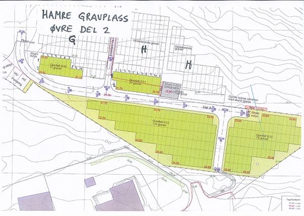 Hamre gravplass ligg ved kyrkja. Her er det nær 1900 graver, delt opp i 10 felt nede ved kyrkja. Den øvre gravplassen er delt inn i 12 felt. Teikningane nedafor viser kor dei ulike felta er. Er du på leit etter ei grav, og ikkje veit heilt kor den er, så kan du kontakte kontoret på tlf 56 97 88 30 og få opplyst kvar grava ligg.