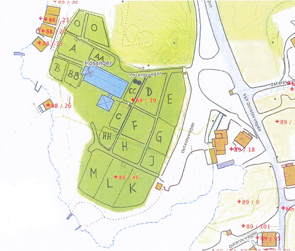 Hosanger gravplass ligg ved kyrkja. Her er det nær 1250 graver, delt opp i 18 felt. Teikninga nedafor viser kor dei ulike felta er. Er du på leit etter ei grav, og ikkje veit heilt kor den er, så kan du kontakte kontoret på tlf 56 97 88 30 og få opplyst kvar grava ligg.