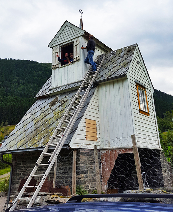 Bilettekst: Irene Midtun, Geir Atle Mjelde og kyrkjeverje Edvin Bratli gjer klart for maling av tårnet. Det er kyrkjegardsarbeidaren Roger Birkelund som har gjort det største arbeidet med god hjelp frå Sigurd Revheim før malararbeidet tok til.